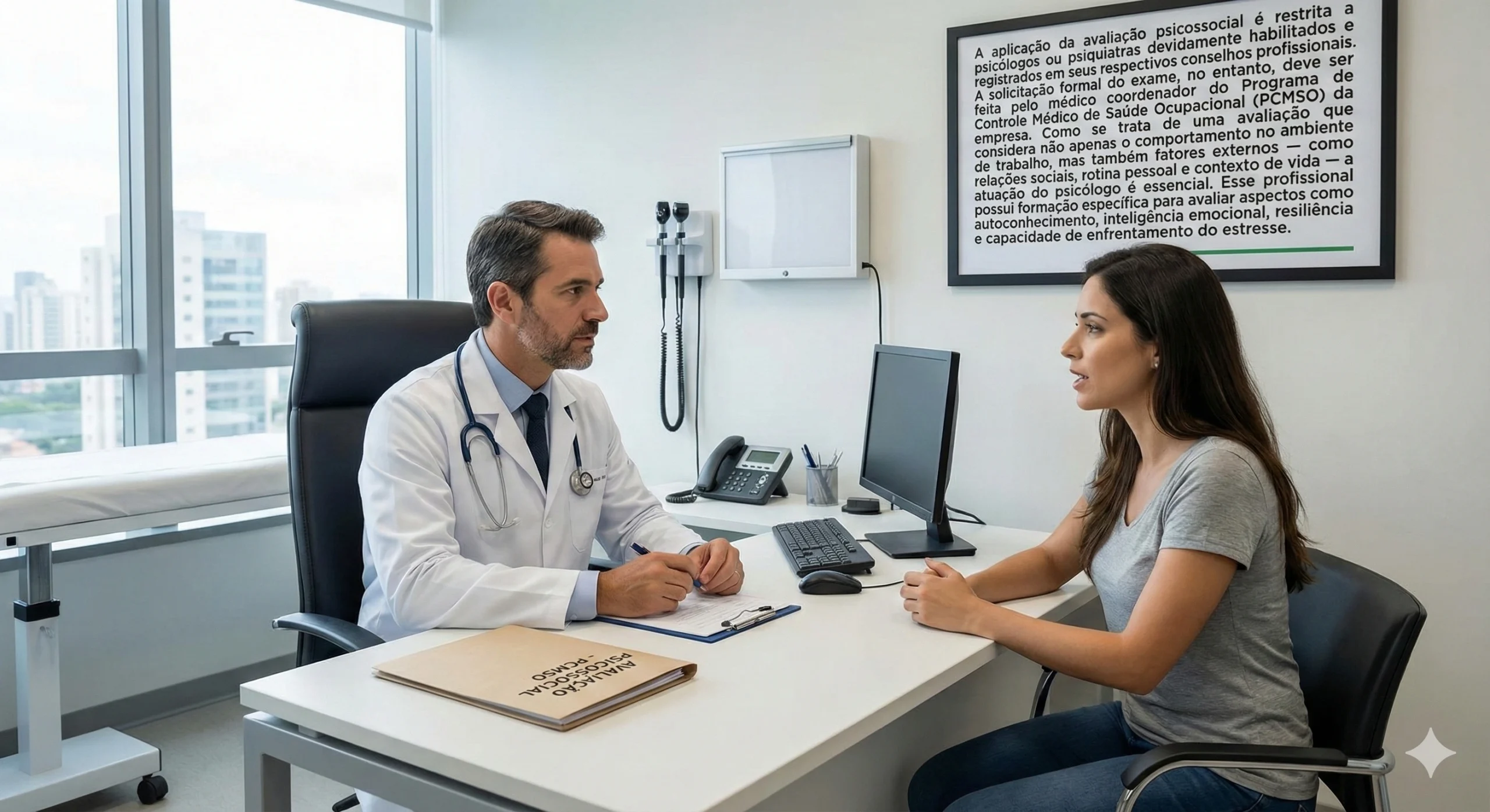 A aplicação da avaliação psicossocial pode ser feita por psicólogos ou médicos do trabalho devidamente habilitados e registrados em seus respectivos conselhos profissionais. A solicitação formal do exame, no entanto, deve ser feita pelo médico coordenador do Programa de Controle Médico de Saúde Ocupacional (PCMSO) da empresa.